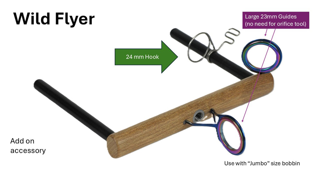 The Wild Flyer is another unique Majacraft innovation. It has been designed to spin art yarns and has a large 23mm ceramic orifice to allow the bulkiest of yarns to flow with ease. The Wild Flyer will also allow you to turn your Majacraft wheel into a bulky spinner, no need to purchase a new wheel to spin carpet style yarns.