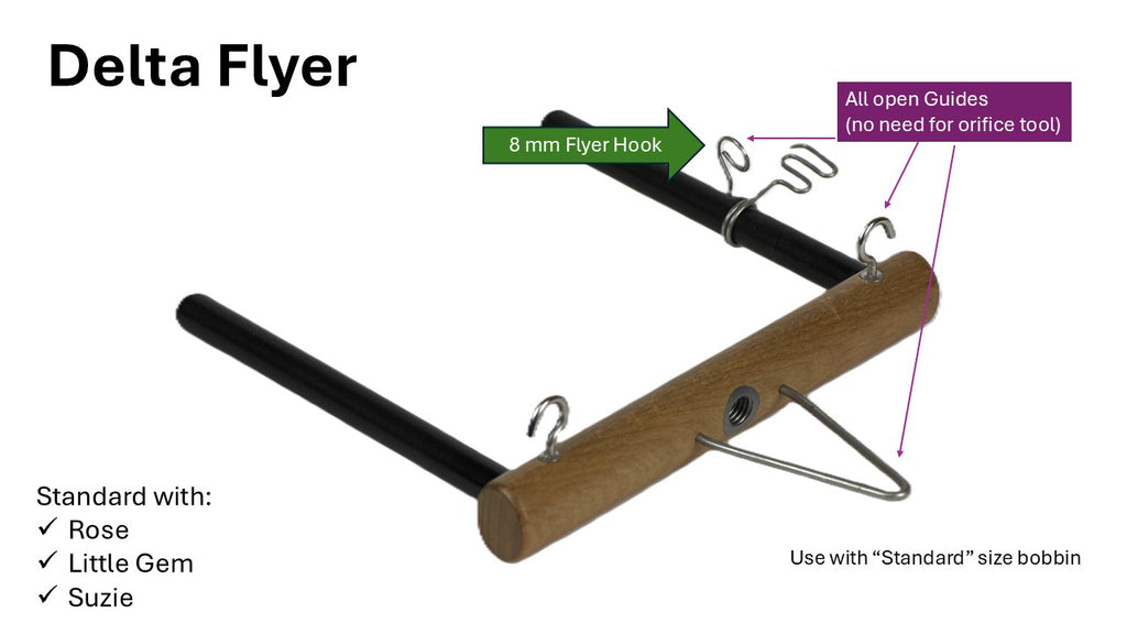 The Delta flyer is unique to Majacraft and is exceedingly easy to use while being a great general purpose flyer. The open cup hooks and delta make threading the yarn simple. There is very little that cannot be done with a Majacraft Delta Flyer.